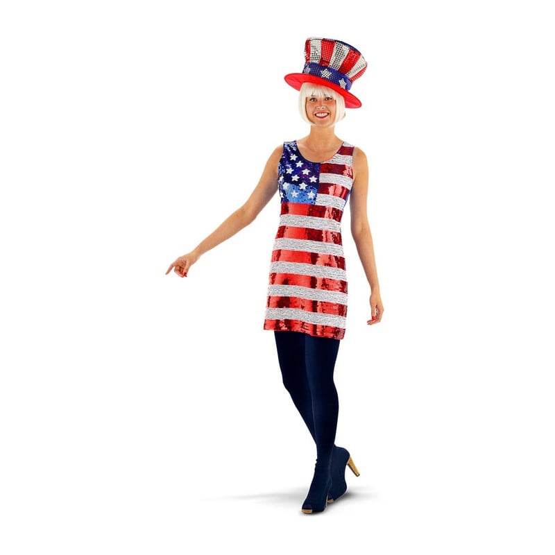 Mooie glitterjurk in de stijl van de Amerikaanse vlag. Met deze USA jurk in Stars en Stripes stijl ben je helemaal klaar voor een Amerikaans feestje.