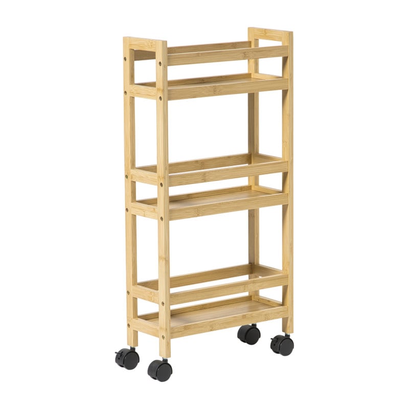 Te veel spullen, te weinig plek? Deze slanke bamboe trolley rolt letterlijk al je badkamerchaos netjes weg. Met vier handige etages en wieltjes is dit jouw geheime wapen tegen rommel. Gemaakt van stevig, natuurlijk bamboe en smal genoeg om in kleine hoekjes te passen. De trolley heeft een hoogte van74.5 cm, een breedte van 36 cm en een diepte van 15 cm.