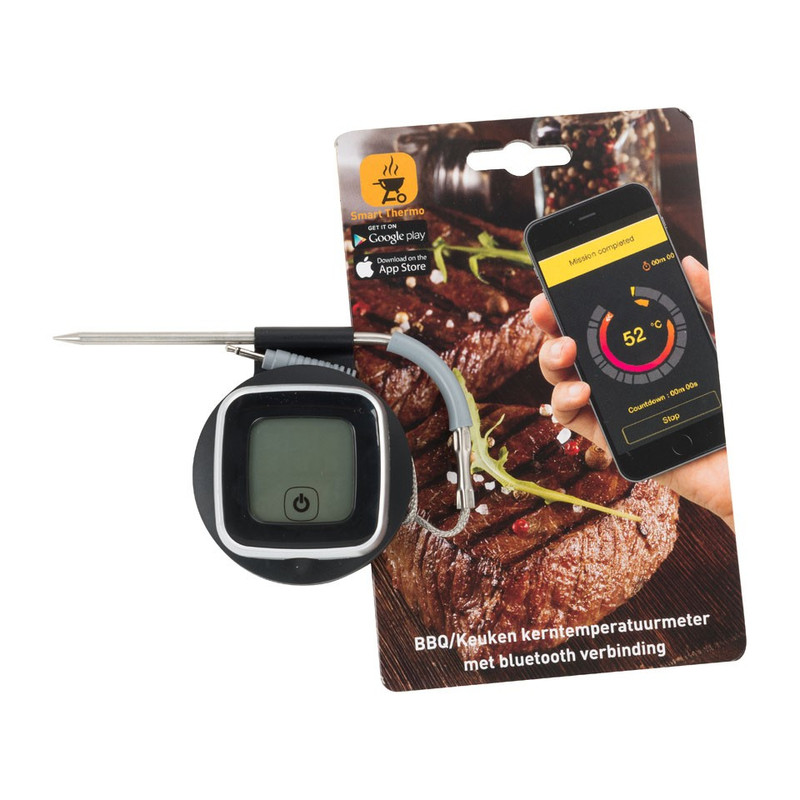 Maak het koken of barbecueën nu nog makkelijker met deze kerntemperatuurmeter met bluetooth! Download gratis de app ‘’Smart Thermo’’ in de appstore en verbindt met iPhone, iPad en Android. Je kunt de temperatuurmeter instellen op temperatuur en/of vleessoort. Je kunt op je smartphone dan heel gemakkelijk zien wanneer het eten klaar is.