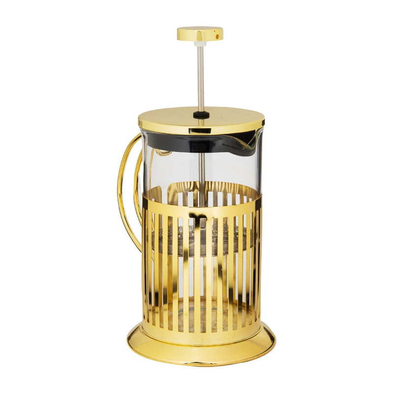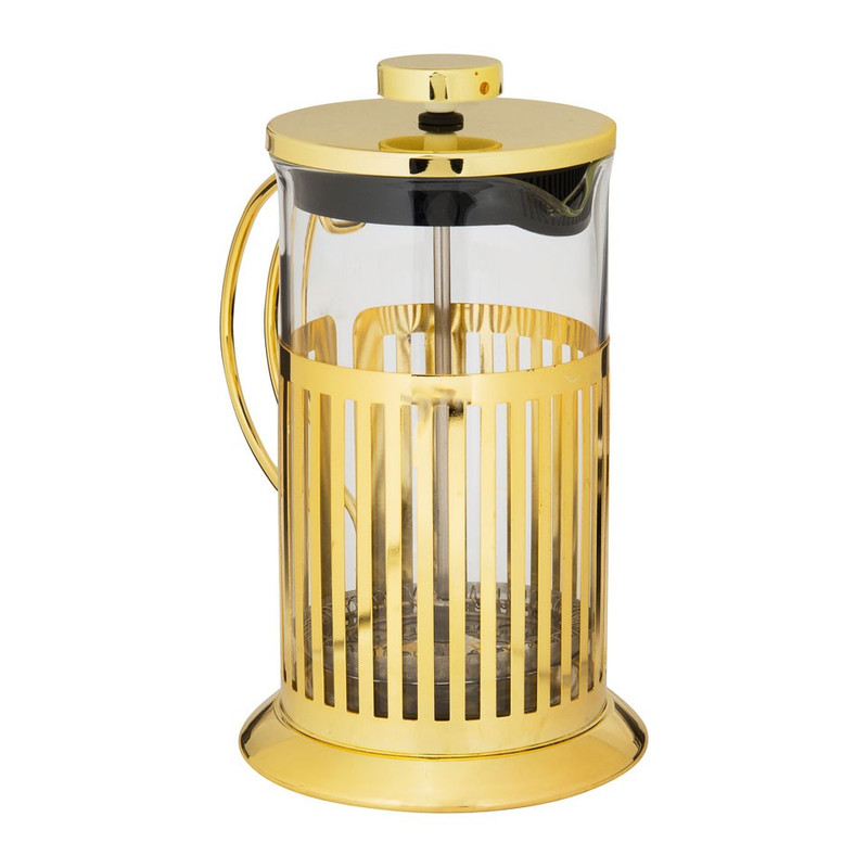 Deze cafetiere met unieke gouden elementen is ideaal om de lekkerste koffie te maken. Er gaat niets boven een vers gezet kopje koffie. Of je nu 's ochtends vroeg begint met koffie of een lekker bakje in de middag wilt drinken, met deze cafetiere zit je altijd goed. Zo werkt het: plaats de cafetiere altijd op een stabiele en droge ondergrond. Haal de filter uit het glas door aan de knop te trekken. Giet er heet water in om de koffiemaker te verwarmen. Na 1 minuut giet je het water er weer uit en voeg grof gemalen koffie naar smaak toe en vul weer met heet water wat net van de kook af is. Roer met een lepeltje en laat de koffie een paar minuten trekken. Plaats de filter op het glas en druk het filter langzaam naar beneden, zodat het de bodem van de glazen beker raakt. Geniet van een heerlijk bakje koffie! Xenos heeft een bijpassende melkopschuimer en theepot, bekijk ze allemaal!