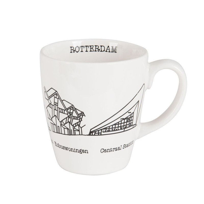 Een mok van je favoriete stad is natuurlijk super leuk. Bij Xenos hebben we de grootste steden op mokken gezet. Leuk om aan iemand cadeau te geven of om er zelf lekker voortaan je koffie uit te drinken. De mok heeft een inhoud van 350ml en is 10cm hoog. Op deze mok van Rotterdam staan de volgende bezienswaardigheden afgebeeld: Erasmus Brug, Haven, Euromast, Kubus Woningen en het Centraal Station.