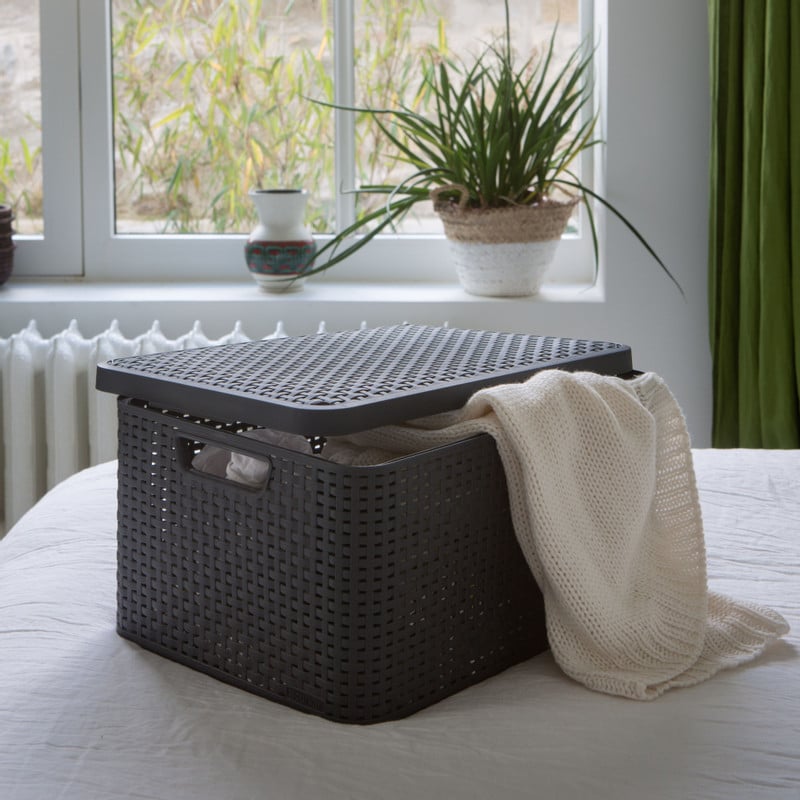 Deze grote Curver mand is dé oplossing voor grotere spullen. Van plaids en handdoeken tot knutselspullen of seizoensdecoratie – alles verdwijnt netjes achter de deksel. Ze hebben de uitstraling van riet maar de voordelen van kunststof: eenvoudig te reinigen en gemakkelijk in gebruik. De opbergmanden hebben een handvat aan beide kanten en een deksel. Ook zijn de opbergmanden gemaakt van 70% gerecycled kunststof.