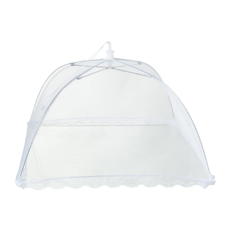 Bescherm je eten tegen beestjes met deze vrolijke foodcover! De cover is gemaakt van polyester en metaal en is wit van kleur. De cover heeft een vierkante vorm en een hoogte van 20 cm, een breedte van 35 cm en een diepte van 35 cm.