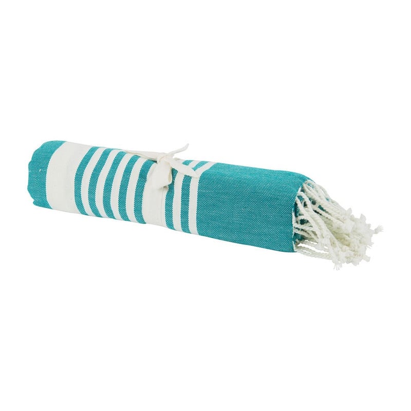 Deze blauwe hamamdoek is erg leuk om op het strand om te slaan of als decoratie op je bank of stoel te leggen. De hamamdoek is blauw met crèmekleurige strepen en heeft aan de uiteinden koordjes hangen.