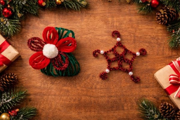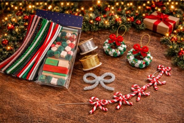 Deze DIY bestaat uit meerdere losse decoraties die je samen of apart kunt gebruiken. Van chenille draad maak je kleine strikjes die je aan elkaar bevestigt tot een slinger. Deze strikjeslinger is leuk langs een plank, aan de muur of in de kerstboom. Daarnaast maak je een grotere losse strik die je kunt gebruiken als decoratie op een cadeau, krans of tak. Ook maak je kleine kerstkransjes door het chenille draad rond te buigen en af te werken met een subtiel detail.
