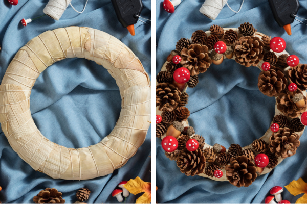 Om te beginnen aan de herfstkrans is het makkelijker om alles klaar te leggen wat je nodig hebt. Daarna is het kwestie van bedenken hoe jij jouw herfst krans eruit wil laten zien. Met het touw kan je bepaalde bladeren wat steviger aan de krans maken en met het lijmpistool kan je eikeltjes en denneappels aan de krans plakken. De paddenstoeltjes die van schuim zijn gemaakt hebben handige prikkers, dus die kan je in de krans steken. Laat jouw herfst knutsel goed drogen en de volgende dag kan je het leuk ophangen aan je voordeur of ergens in de woonkamer zetten.