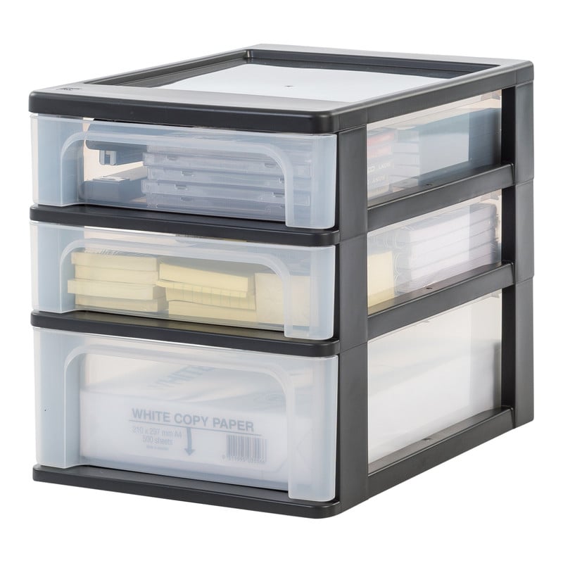 Iris biedt de perfecte oplossingen in opbergen. Dit handige ladesysteem van Iris heeft een zwart frame, is voorzien van 2 kleine transparante lades en 1 middelgrote lade. De inhoud per kleine lade is 4 liter en de binnen afmetingen zijn L315xB215xH68mm. De inhoud van de middel grote lade is 7 liter en de binnen afmetingen zijn L315xB215xH105mm. Ideaal voor in huis of op kantoor.