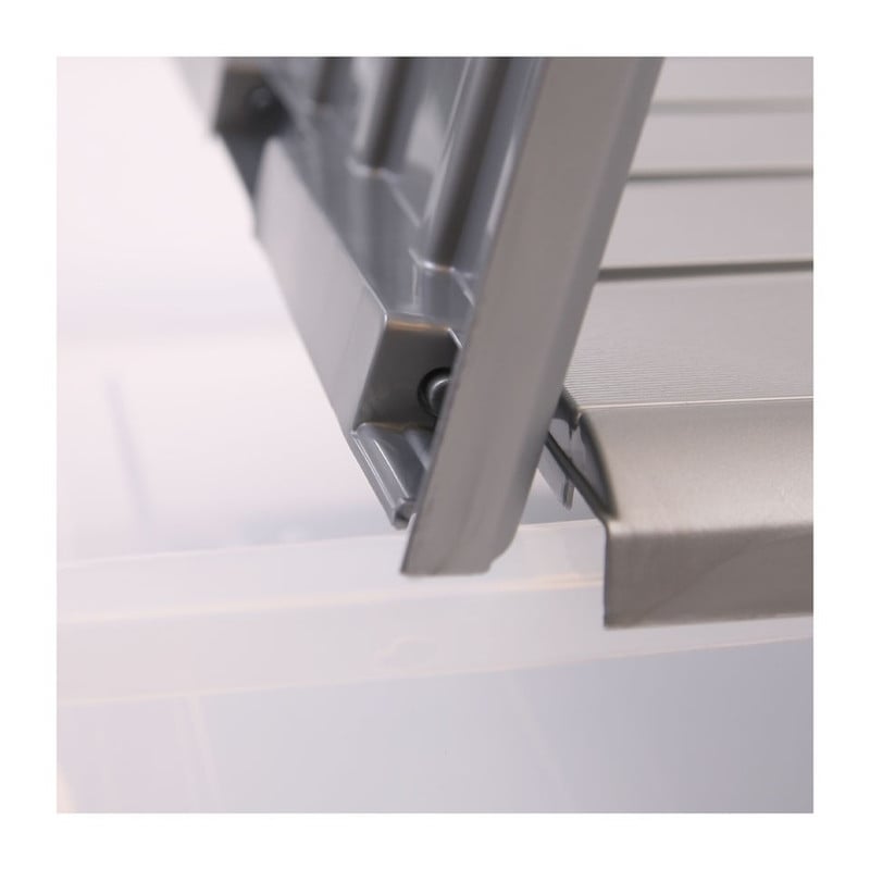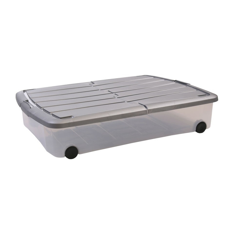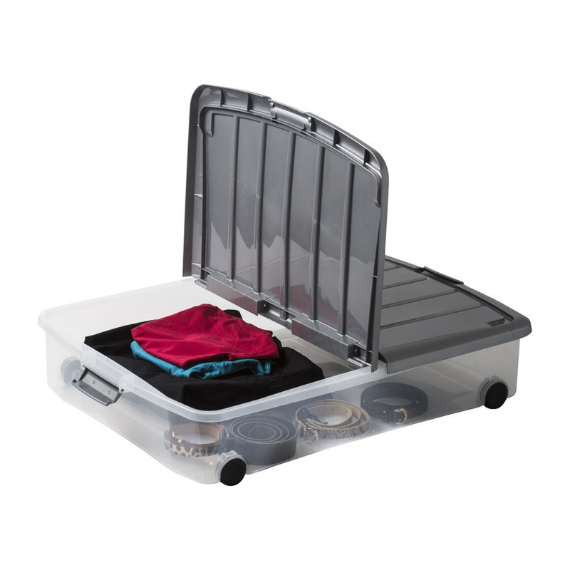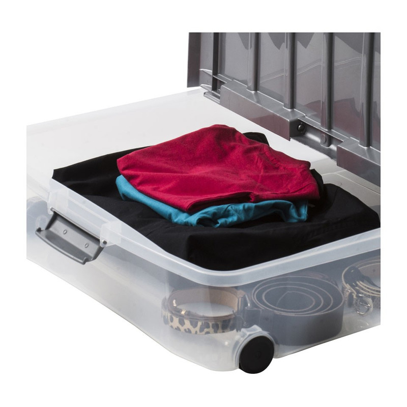 Iris biedt de perfecte oplossingen in opbergen. De zeer stevige Roller Box van IRIS is ideaal voor onder het bed. De onderbedbox is transparant en voorzien van stevige handgrepen en een zilver klemdeksel die je helemaal open kunt doen maar ook voor de helft tot 90°. De opbergbox heeft een inhoud van 50 liter. Daarnaast kun je de box door de wieltjes makkelijk verplaatsen. Ook kan er ruimte gespaard worden doordat de opbergboxen nestbaar zijn en dus in elkaar gestapeld kunnen worden als ze niet worden gebruikt. De IRIS Roller Boxen range biedt je de mogelijkheid om alle huishoudelijke artikelen zoals: speelgoed, schoenen, kleding en andere accessoires op te bergen. De opbergboxen kunnen handig gebruikt worden in de woonkamer, slaapkamer, keuken, badkamer, garage, kantoorruimte, kinderkamer en overige ruimtes.