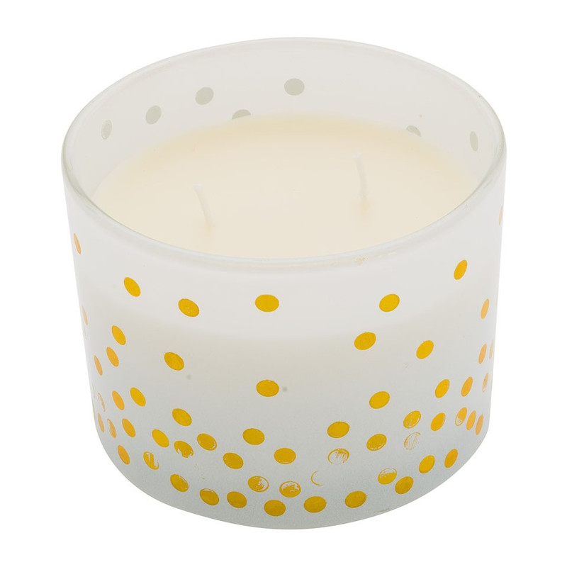 Creëer rust en gezelligheid in huis met deze sfeervolle kaars in glas. Deze grote kaars heeft een dubbele lont, waardoor je extra veel licht van de kaars krijgt. Het glas is wit met gouden stippen. Leuke decoratie in je huis tijdens de kerst, maar ook erg leuk buiten het kerstseizoen te gebruiken. Het glas schijnt een beetje door, wat een mooi effect geeft als de kaars aan is. Het glas kun je hergebruiken als je kaars opgebrand is. Er kan bijvoorbeeld een nieuwe kaars in gezet worden, maar je kan hem ook vullen met iets anders, zoals een plantje.