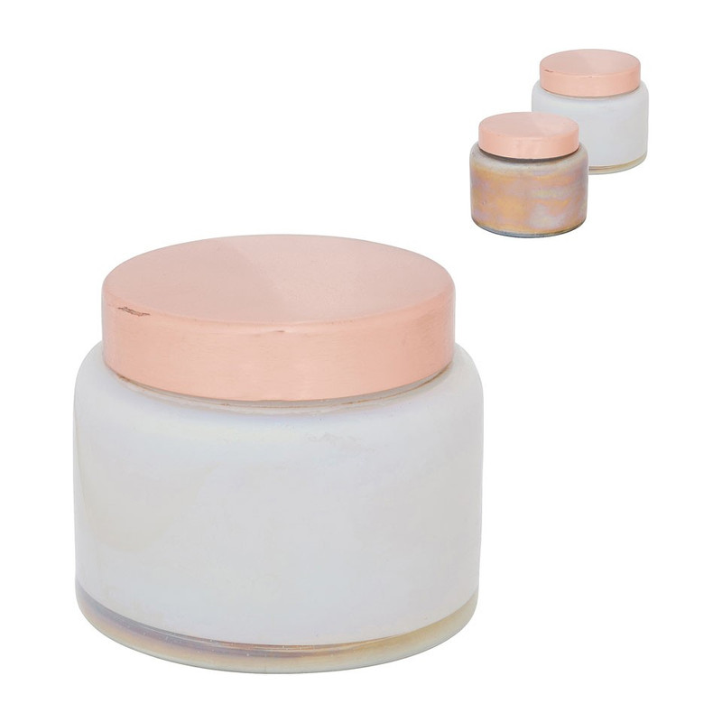 Maak het gezellig in huis met behulp van deze leuke kaars in glas. Het kleine glazen potje is voorzien van een koperkleurig dekseltje. Het kaarsje is 5.5 cm hoog en heeft een diameter van 7 cm.