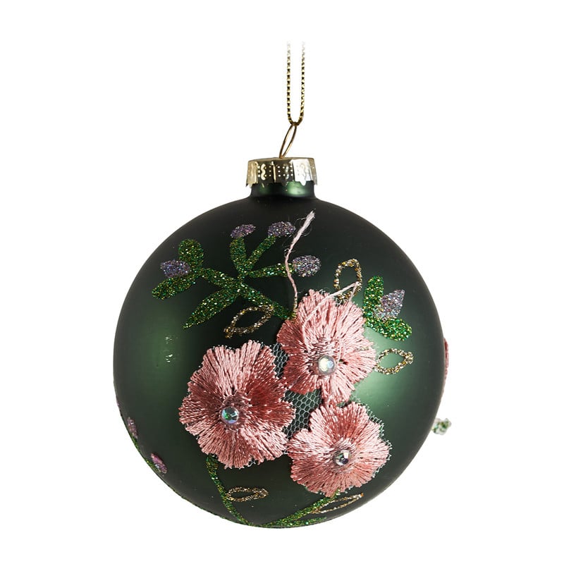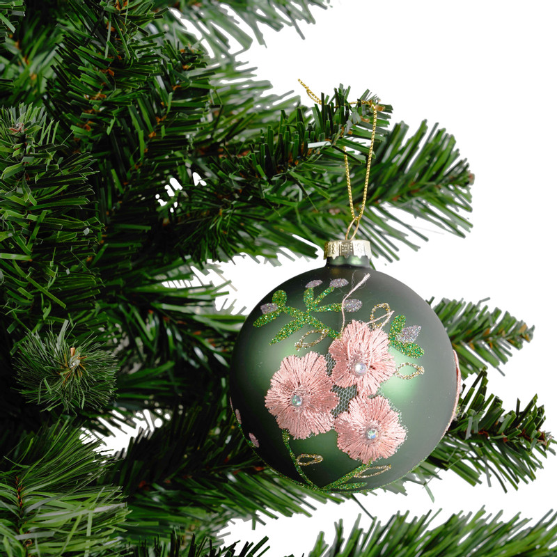 Deze prachtig elegante kerstbal zal jouw kerstboom helemaal opfleuren. Door de groene kleur met de chique bloemen zal het zorgen dat jouw ruimte klaar is voor de kerstdagen. Deze kerstbal is gemaakt van glas en is 8 cm groot.