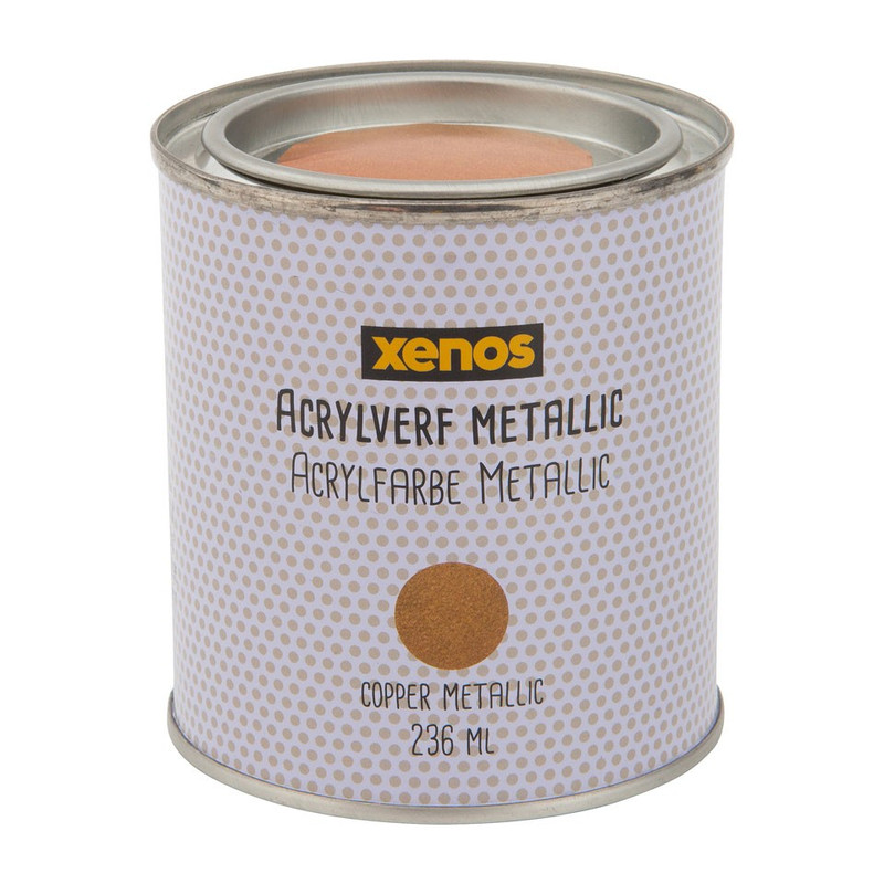 Pimp je kinderkamer, hal of meubels met deze metallic acrylverf in koperen kleur. Dit blik met metallic acrylverf van 236 ml bevat genoeg verf om een tijd mee te schilderen. De acrylverf is op waterbasis. Super leuk om een oud kastje mee op te knappen bijvoorbeeld.