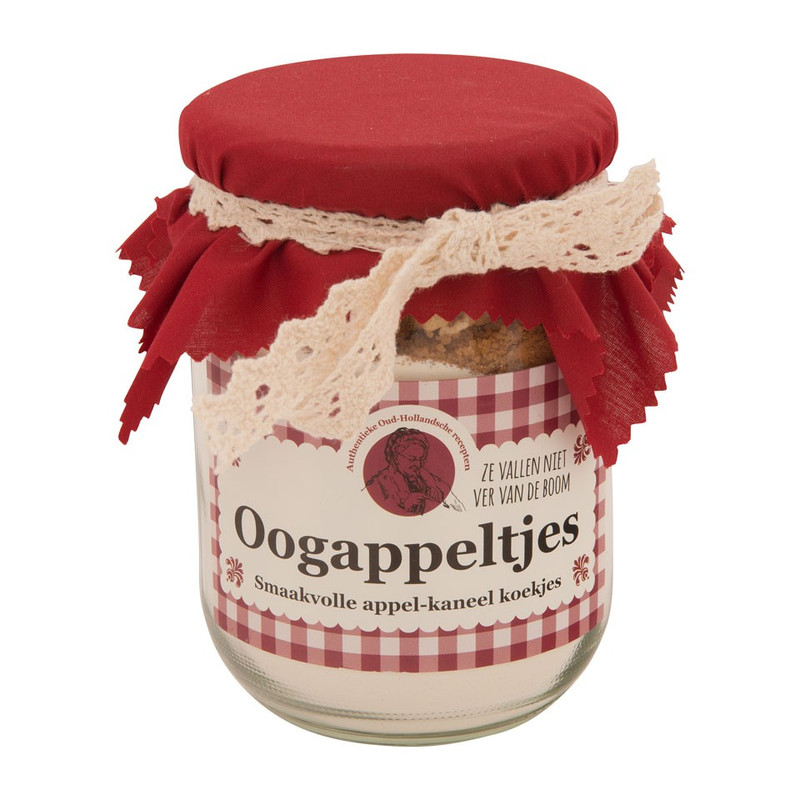 Geef dit leuke cadeau weg op een verjaardag of feestje. Een potje voor jouw oogappeltje, superlief! Er zit een heerlijk mix in voor een lekkere appel kaneel koekjes om zelf te maken. De gebruiksaanwijzing staat op de achterkant. Verras iemand en geef hem of haar een pot ‘Oogappeltjes’. De pot is mooi versierd met een afdekhoesje en een leuk ouderwets lintje. Makkelijk, lekker en een leuk cadeautje om weg te geven.