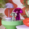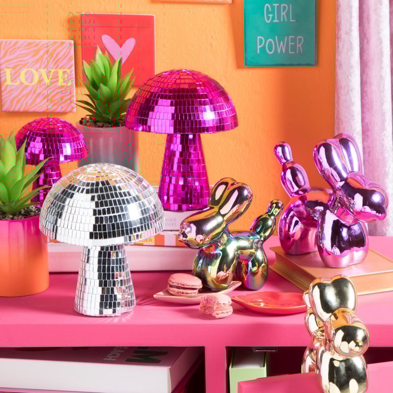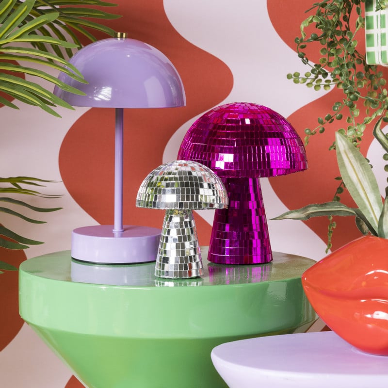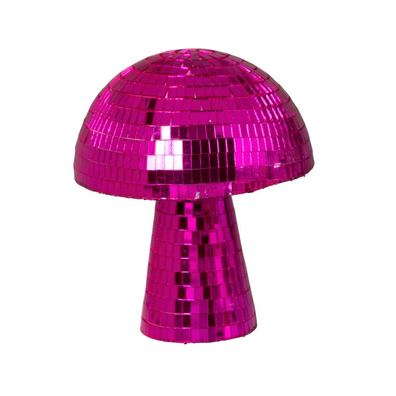 Het oppervlak van deze disco paddenstoel is bekleed met roze spiegelglas, dat het licht opvangt en weerkaatst in je kamer en zorgt voor schitterende lichtjes. Leuk als decoratie in je slaapkamer, woonkamer, hal of elke andere ruimte waar je een vleugje sprankeling wilt toevoegen. De paddenstoel heeft een hoogte van 18 cm en een diameter van 15 cm.