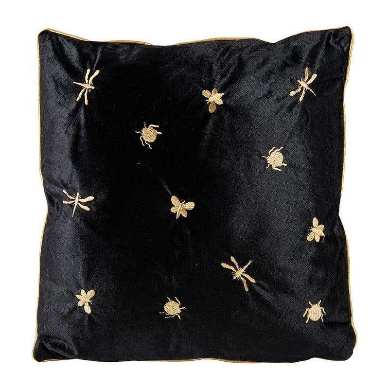 Wat leuk is dit zwarte kussen met goudkleurige insecten erop. De afmetingen van het kussen zijn 43 x 43 cm. De afneembare kussenhoes kan met de handwas gereinigd worden. Om het artikel mooi te houden strijkt of reinigt u het artikel dus niet anders dan aangegeven.