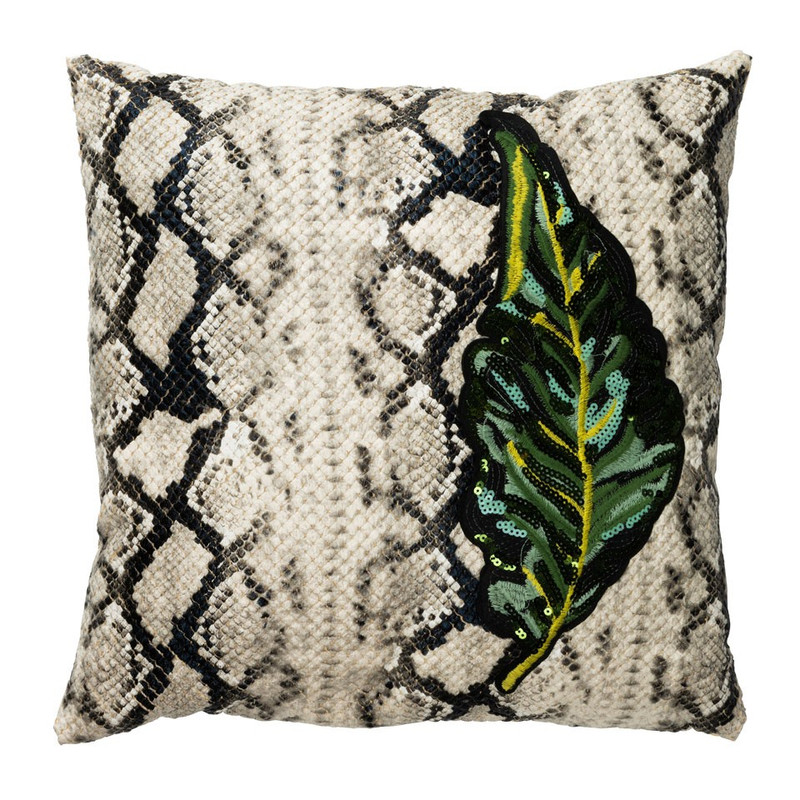 Het stevige kussen is een echte eyecatcher op je bank of stoel. De zwart/witte slangenprint in combinatie met het blad in groene tinten zorgt voor een natuurlijke, stijlvolle uitstraling. De afneembare hoes is gemaakt van polyester en katoen. De afmeting van het kussen is 45x45 cm. Leuk om dit kussen te combineren met andere natuurlijk elementen zoals cactussen, hout of kaarsen in natuurtinten.