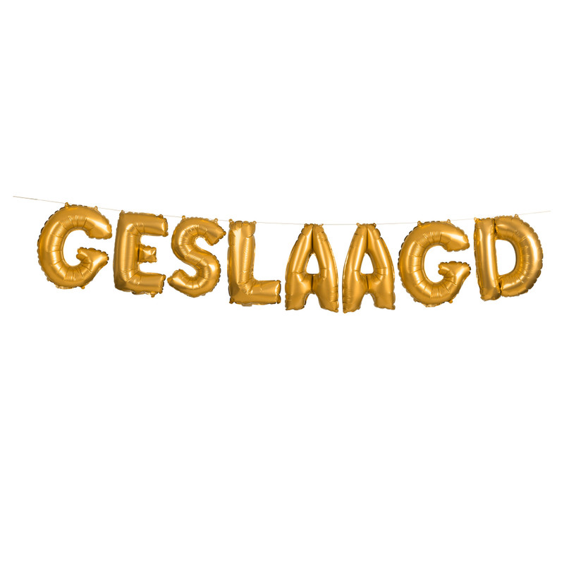 Feest in de lucht! Deze slinger met folieballonnen vormt samen het woord "GESLAAGD" en is dé eyecatcher op elk examenfeest. Makkelijk op te hangen, herbruikbaar en super feestelijk.