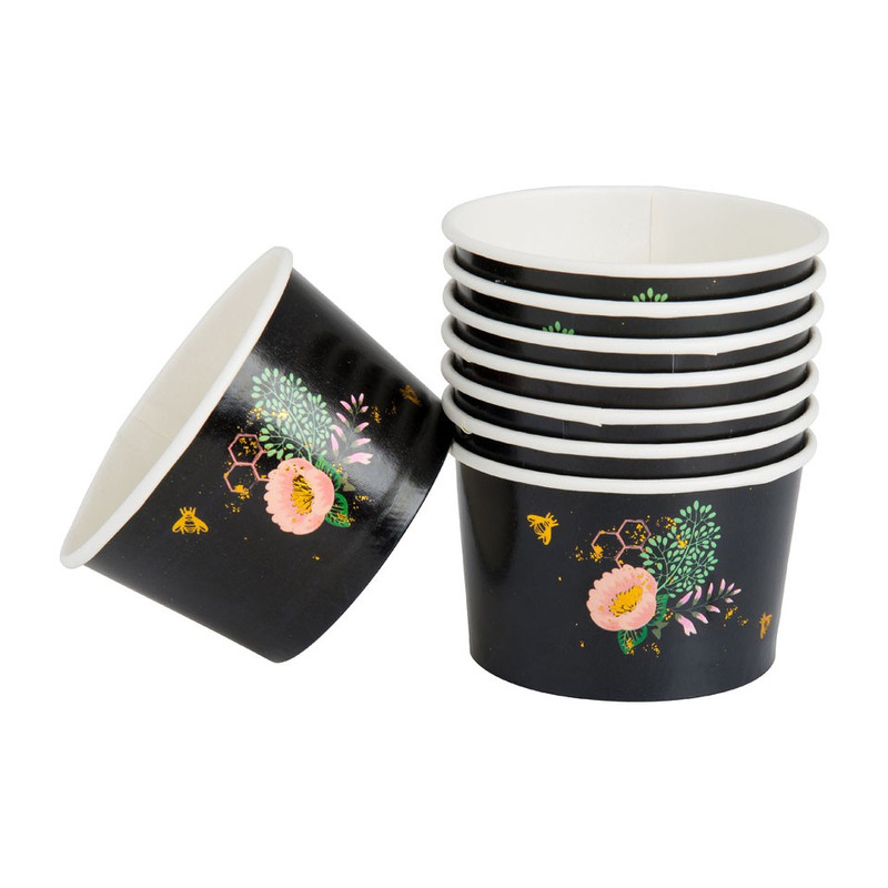 Deze stijlvolle wegwerp snackbakjes zijn ideaal voor al je snacks tijdens een feestje! Deze mooie serie van wegwerp artikelen heeft een zwarte achtergrond en een prachtige tekening van bloemen en een honingraat met bijen. Deze wegwerp bakjes mogen gezien op een feestje. De bakjes zijn gemaakt van papier, hebben een doorsnede van 9.5 cm en zitten in een set van 8 stuks. Met de bijpassende bekers, borden, prikkers, servetten creëer je een stijlvolle feestelijke sfeer. Bekijk ze allemaal!