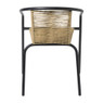 De stoel heeft een metalen frame en een wicker zitting en rugleuning, een materiaal dat weerbestendig en onderhoudsvriendelijk is.