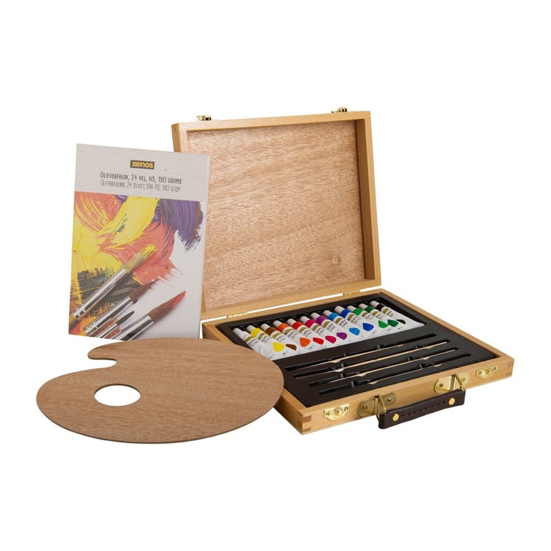 In deze starterset zit alles wat je nodig hebt om een eigen schilderij van olieverf te maken. Olieverf is een traditionele verf met intense kleuren. Hiermee kun je zowel dun als dik schilderen en kun je de typerende penseelstreek van olieverf creëren. Omdat de verf langzaam droogt, kun je je werk altijd nog iets aanpassen.