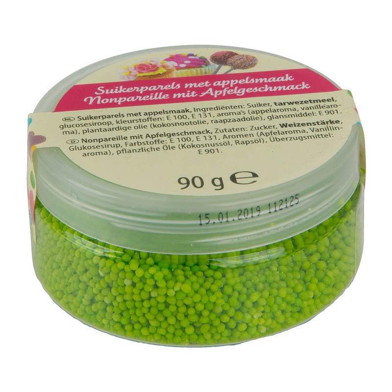 Heerlijke suikerparels met appelsmaak die jouw baksels extra mooi en lekker maken. Versier er bijvoorbeeld je cupcakes mee of creëer een mooi gekleurd randje om je taart. In het potje zit 90 gram aan gekleurde parels. Bekijk ons assortiment voor al je bakbenodigdheden.