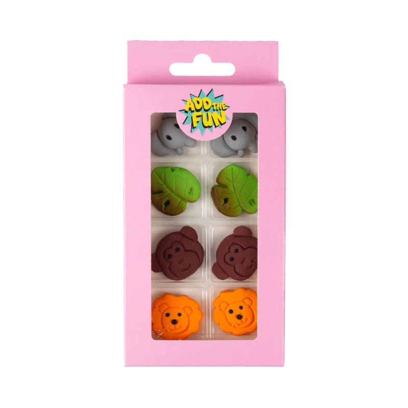 Aapjes, bladeren en tijgers – allemaal eetbaar! Deze jungle taartdecoratie maakt van elk baksel een kleurrijk avontuur. Leuk op cupcakes, taarten en muffins.