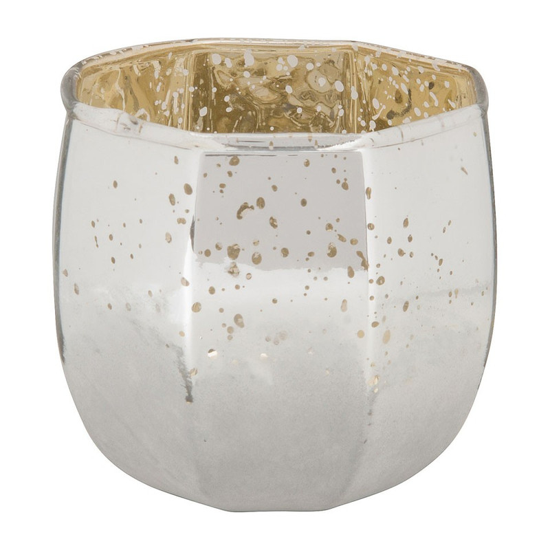 Deze mooie theelichthouder zorgt voor een sfeervol lichtje waar je 'm neerzet. Er past 1 waxinelichtje in die door het zilverkleurig glas een mooi lichtspel geeft. Aan de buitenkant zit een grijze coating voor een extra sfeervol effect.