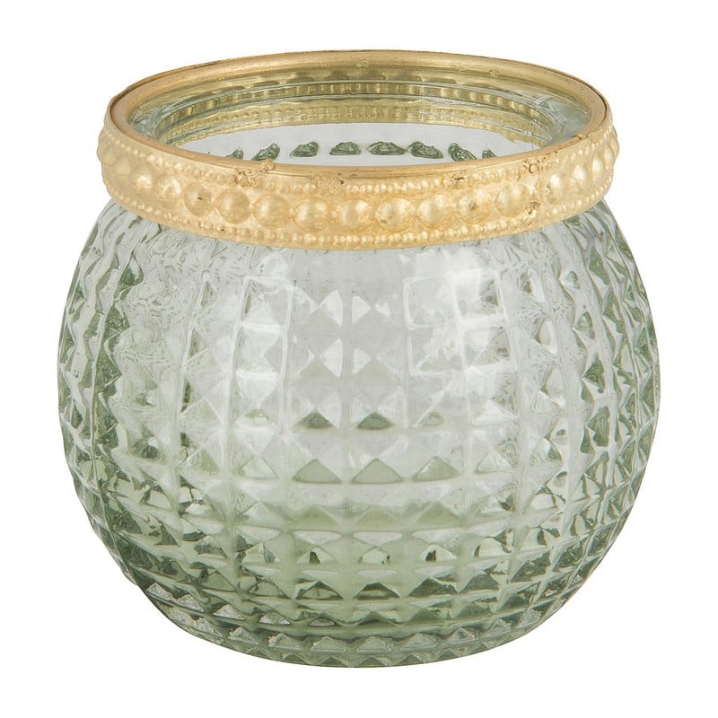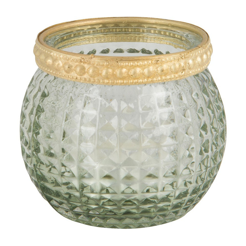Met deze kleine groene theelichthouder met goudkleurig randje creëer je sfeer in huis. Met deze glazen waxinelichthouder wordt het nog sfeervoller in huis. De glazen waxinelichthouder heeft als extra decoratie een kleine metalen sierrand aan de bovenkant. De theelichthouder is verkrijgbaar in diverse kleuren en stijlen. De afmeting van de houder is 6x6 cm en gemaakt van glas.