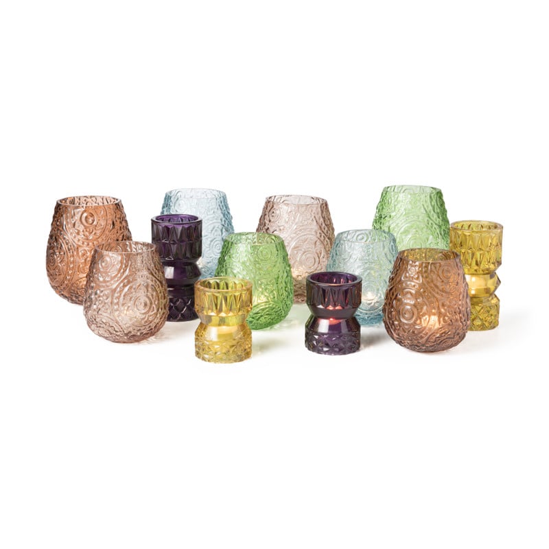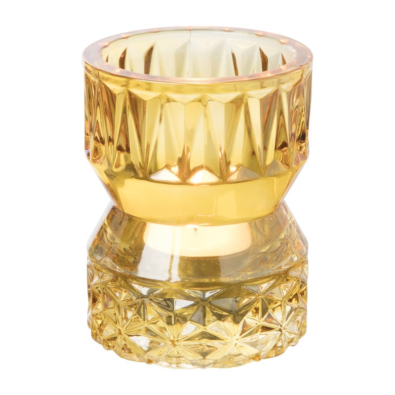 Deze okergele theelichthouder in de vorm van een zandloper is gemaakt van glas en heeft reliëf aan de boven- en onderkant. De waxinelichthouder heeft de afmeting: ⌀7x9 cm en is er ook in andere kleuren en formaten.