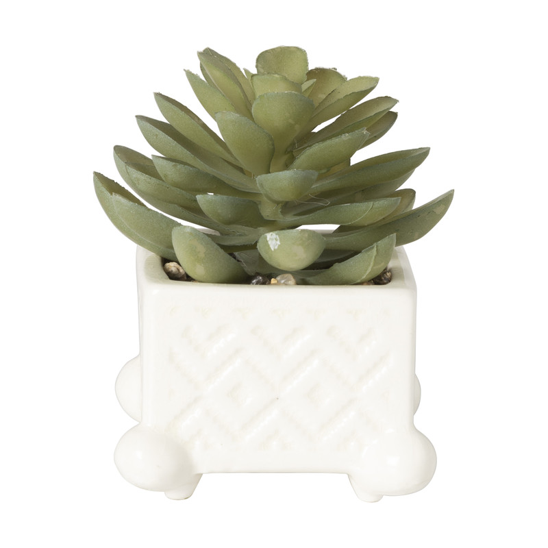 Voeg een vleugje groen toe in huis met deze vetplantjes! Het kunstplantje is geplant in een mooie pot. Deze kunstvetplantjes zijn niet alleen leuk om naar te kijken, maar ook gemakkelijk te onderhouden: ze hebben namelijk geen water nodig. Het potje is gemaakt van keramiek, heeft reliëf patroon en is wit van kleur.