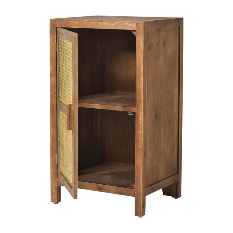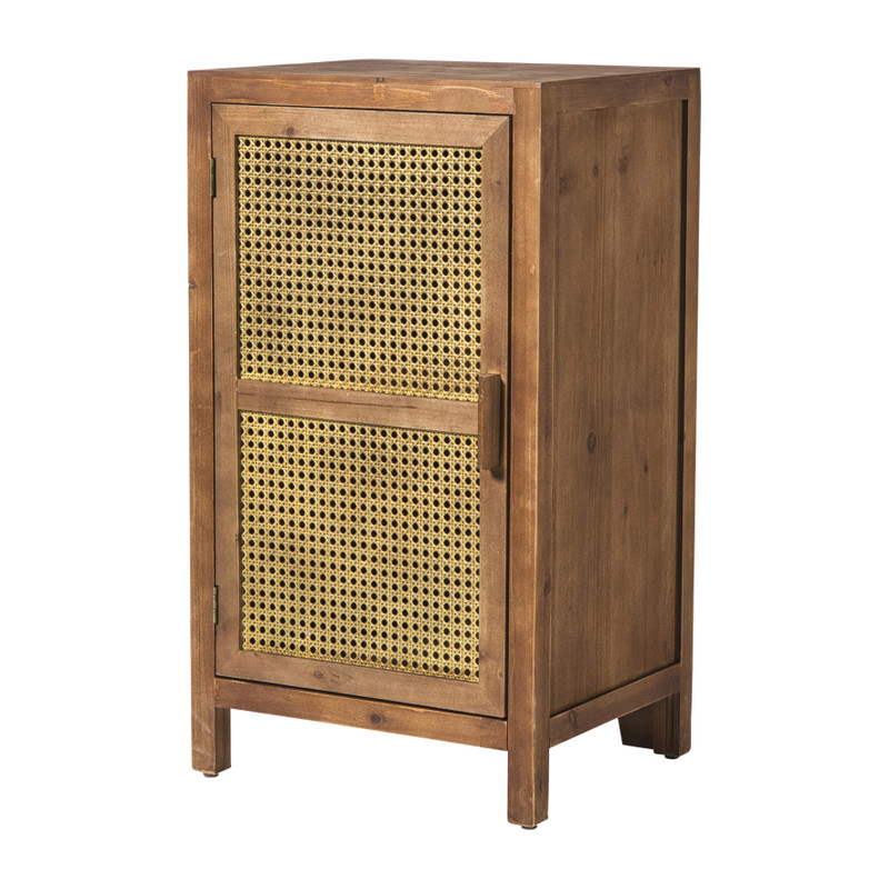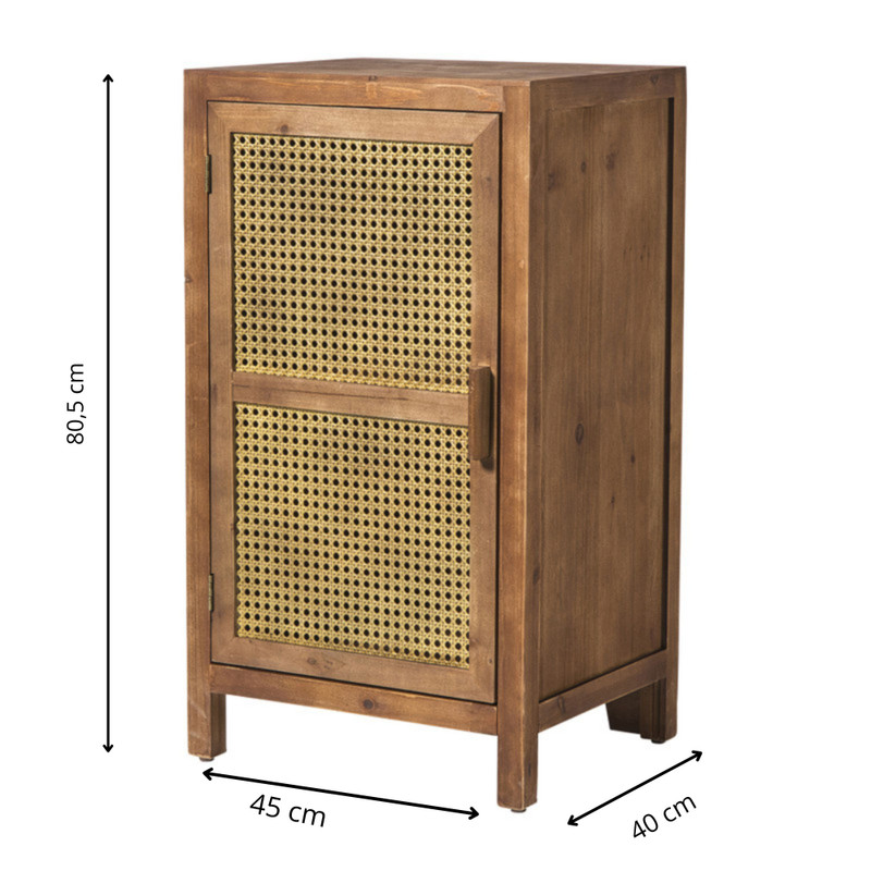 Deze kast is gemaakt van hout en de voorkant van de deurtjes zijn gemaakt van webbing. Webbing is een speciale manier van rotan vlechten en bestaat sinds het begin van de twintigste eeuw, maar is nu helemaal terug van weggeweest! Het vlechtwerk zorgt voor een bohemian en retro look: helemaal van deze tijd dus.