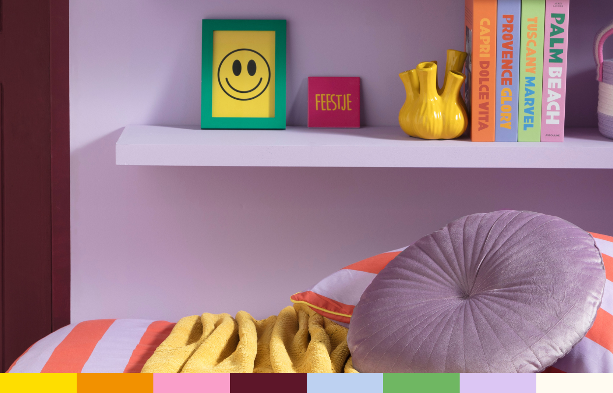 Maak een statement en verf alle wanden én het plafond van je slaapkamer in een mooie kleur. Denk aan lichtblauw of lichtlila. Verf eventueel ook een wandplankje mee in dezelfde kleur en zet daarop leuke decoratie zoals plantjes, fotolijsten en ornamenten.